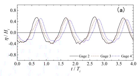 In experiments, various wave steepness and wave height values were employed for testing the physical model, as previously mentioned. When Hi/Li is equal to 0.06 or the wave height is large for shorter waves, the incident wave is nonlinear, and deformations of the water waves occur after interacting with the proposed breakwater–WEC system. By making use of the data recorded by wave gages, the fluctuations in free surface elevations upwave the floating pontoons can be compared and analyzed. Figure 7 presents the variations of free surface elevations for two cases with the same wave steepness but different wave period. For the longer wave of Ti = 1.8 s, as shown in Figure 7a, the nonlinearity of the incident wave can be recognized, and the wave is reflected moderately. The reflection coefficient is estimated to be 0.19 using the three gages method mentioned earlier. The wave amplitudes at gages 2–4 are similar with the incoming wave; whereas perturbations are found at the wave trough, which may be caused due to the strong wave deformations during the process of wave–structure interaction. The phase difference among these three time histories is observed to be diminutive since the spacing of wave gages is relatively short compared to the wavelength (Li = 3.82 m). In contrast, the wave surface profiles at gages 2–4 are considerably affected by the evolved reflected waves for the shorter wave (Ti = 1.05 s), and a standing wave may form in front of the floaters, as verified by Koutandos et al. [27]. According to the theory of standing wave, the superposition of two waves moving in opposite directions (the incident wave and reflected in this study) will strengthen the vertical movement of water at some positions (called antinodes), and cause water to have the least displacement in vertical direction at some other points (called nodes). At gage 2, the wave amplitude is attenuated because it is close to the nodes, while the wave amplitude at gage 4 is enlarged as it is near the antinodes. Moreover, the nonlinearity of the water waves is enhanced during the process of interacting with the hybrid system, and higher harmonic occurs, as can be seen in the figure. After separating the reflected wave from the incident wave, the reflection coefficient for the case in Figure 7b is calculated to be 0.64.