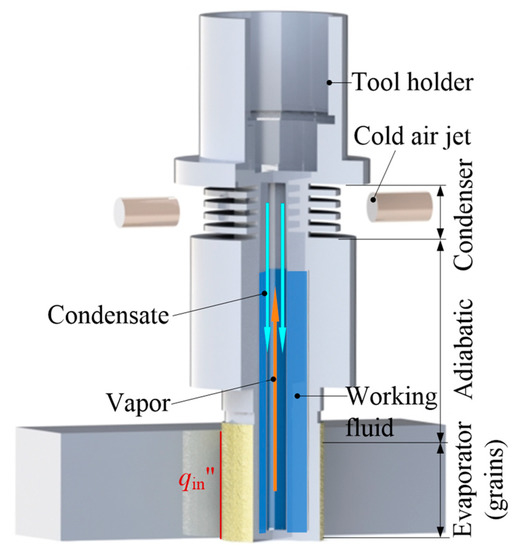 - Chen, J.J.; Fu, Y.C.; Gu, Z.B.; Shen, H.F.; He, Q.S. Study on heat transfer of a rotating heat pipe cooling system in dry abrasive-milling. Appl. Therm. Eng. 2017, 115, 736–743. [Google Scholar] [CrossRef]