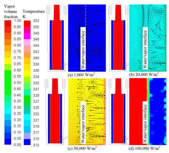 The heat transfer coefficient for heat flux of 2000, 20,000, 50,000 and 100,000 is shown in Figure 3. The heat transfer coefficient increases with the increase of the heat flux. The temperature outside the evaporator is also higher with higher heat flux. This result should be attributed to more fierce convection or boiling heat transfer caused by higher ΔT. Therefore, the heat transfer mechanism in the RHP was analyzed and is shown in Figure 4. The global phase distribution in the RHP is plotted in Fluent and shown in Figure 4, the red color refers to the vapor phase (referenced as value 1 in the first legend), the blue one refers to the liquid phase and the mixture phase is displayed as the color between red and blue. For the cases without bubbles (Figure 4a–c), the local temperature distribution overlaid by velocity vectors are displayed and zoomed on the right. The specific temperature value can be referenced to the second legend.
