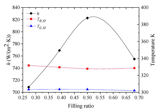 Filling ratio is another effect that will influence the heat transfer performance of RHP-GW, which is defined as the volume ratio of the working fluid and RHP. The simulations were performed under a heat flux of 20,000 . Different filling ratios of 27.3%, 39.2%, 50% and 68.2% were analyzed, which are the equivalent to a film thickness of 1, 1.5, 3 and 3.5 mm.