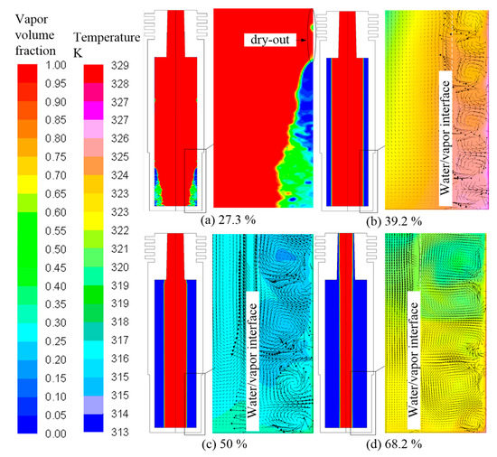 The best heat transfer performance was found with the filling ratio of 50%, which showed the highest average heat transfer coefficient of 822.6 and the best mean temperature performance with the smallest temperature difference of 24 K (as shown in Figure 5). The convection cells are much more unsteady than the other cases, as shown in Figure 6c, which turned out to facilitate the convection process. Increasing the filling ratio to 68.2% reduces the heat transfer in RHP-GW due to the increase of liquid film thickness, which also covered the condenser section (as shown in Figure 6d) and thus weakened the heat exchange there. Reducing the filling ratio also reduces the heat transfer coefficient because of the “dry-out” of the liquid phase (as shown in Figure 6a), which makes it difficult to achieve a continuous thermal dynamic process.
