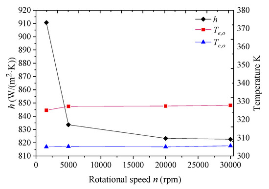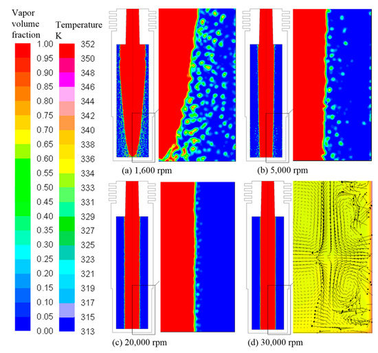 Rotational speed was investigated from 1600 to 30,000 rpm. Other conditions are as follows: filling ratio of 50% and input heat flux of 20,000 . The simulation results are shown in Figure 7. As the rotational speed increases from 1600 rpm to 5000 rpm, the average heat transfer coefficient decreases from 910.7 to 833.6 , which decreases by nearly 9%. This is because the nucleate boiling in the evaporator was suppressed gradually as the rotational speed increases, as shown in Figure 8a,b. When the rotational speed increases from 5000 rpm to 30,000 rpm, the averaged heat transfer coefficient decreases slowly from 833.6 to 822.6 . According to Figure 8b–d, although increasing the rotational speed suppresses nucleate boiling, convection heat transfer increases because of the higher rotational speed.