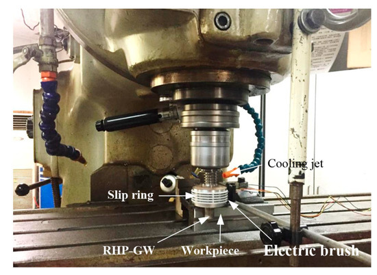 In order to verify the superior cooling effect of RHP-GW and for validation of the simulation method, a dry grinding experiment was carried out. The grinding experiment was carried out on a milling machine, and the experimental setup is shown in Figure 10.