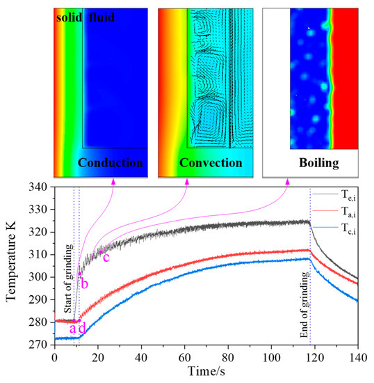 Figure 11 shows the temperature variation on the inner wall of the RHP. According to the temperature curve, the startup time of the RHP-GW was about 60 s. The temperature variation reflects the startup process of the RHP inside the grinding wheel. During grinding, three distinctive stages can be identified. The first stage (from point a to point b) can be treated as an unsteady lumped heat conduction, which took place through the composite layer of grains and wheel matrix, therefore an exponential temperature increase was found. Since the layer of the matrix was thin, this stage lasted only 3 s. It should also be noticed that there was a time lag of about 3 s for the temperature signals on the adiabatic and condenser sections (from point a to point d), which was in accord with the heat conduction time in the solid grinding wheel matrix in the first stage. Then, the temperature increasing rate decreased gradually due to the convection heat transfer in the liquid layer (from point b to point c). Finally, boiling occurs and the temperature is stabilized at about 321 K without demonstrating any oscillation and overshoot. The start-up process turned out to be in reasonable agreement with the simulation results.