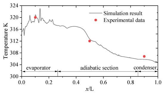The temperature distribution in the RHP at the steady state was compared with the simulation results under the same condition with a filling ratio of 50% and a rotational speed of 5000 rpm, as shown in Figure 12. The significant temperature fluctuation obtained by simulation can be found in the evaporator section, which should be caused by the natural convection and boiling inside the liquid layer. The temperature distribution becomes smoother in the adiabatic section and condenser section. The prediction of the overall temperature distribution by the simulation was in good agreement with the experimental result with a maximum error of 0.5%. Therefore, the simulation method applied in this investigation is capable of predicting the heat transfer performance of the RHP-GW, which will highly improve the research efficiency and lower the manufacturing costs.