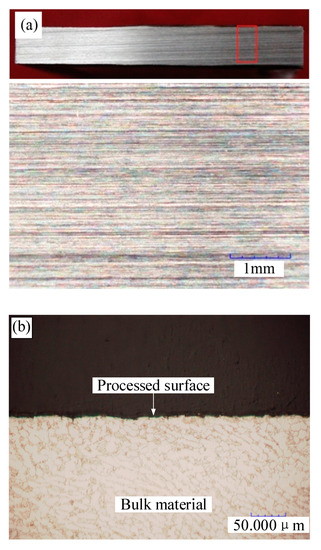 Observations of the workpiece ground surface was carried out, as shown in Figure 14. The surface of the workpiece was smooth without any burnt color. The microstructure of the workpiece beneath the ground surface was observed. The grains in the ground layer was almost identical with the bulk material, which means that the grinding temperature was successfully controlled by the RHP in the grinding wheel. Besides, the conclusion can be also drawn that the optimized parameters that obtained by simulation was suitable for the RHP-GW.