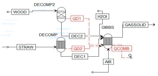 Figure 1 shows the flowsheet for the simulation of the co-incineration of rice straw and wood pellets. In short, wood and straw pellets are firstly decomposed into their main elemental constituents (blocks: DECOMP/DECOMP2). Two streams containing the composition (DEC1/DEC2) and the heat of decomposition (QD1/QD2) exit the block and are directed to the reaction unit (GIBBS). In it, together with the humidity (H2OI) and combustor agent in stoichiometric conditions (AIR), combustion takes place assuming equilibrium. As a result, one stream containing the material balance (GASSOLID) and another stream with the produced heat of combustion (QCOMB) are obtained. Specific details on this model can be found in [].