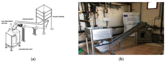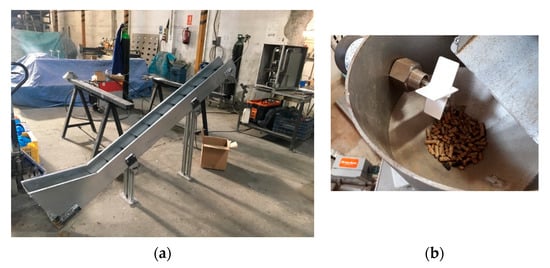 The conveyor belt allows the transport of feedstock from the silo to the incineration unit. Pellets fall from the initial storage and travel upwards on the belt (materials: steel + PVC (transporting side) + TPU (bottom side)) (Figure 4a) upon the top part where they fall into a second storage unit (volume: 0.005 m3). The belt has a length of 4.55 m and a width of 0.15 m with regularly spaced partitions every 0.175 m. This second silo (Figure 4b) permits a further control on the mass flow rates while acting as an additional security element. As in the previous storage unit, a level sensor is located inside the storage unit to avoid accumulation of feedstock.