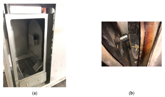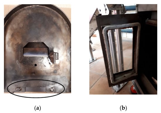 Pellets enter the combustion chamber from the dosing silo through the feeding tube regulated by a rotary valve. Air is conveyed from the outside into the combustion chamber through an air conveyor. Inside this chamber, on its back surface, two ignition glow plugs (250 W each) are installed (length = 140 mm). Downstream the combustion chamber, a smoke fan is installed with a dual function: (i) to extract the fumes from the combustion chamber towards the outside and (ii) to ensure the entry of air. A box (length = 0.19; width = 0.304 m; height = 0.094 m, for a total volume = 0.0055 m3) is placed at the chamber’s bottom to collect the ashes produced during combustion (Figure 6a). The chamber is closed with an isolated door with a glass window (Figure 6b) to observe the flame and visually control the process. Four temperature sensors are placed inside the chamber (top, gas outlet, hearth of the combustion chamber and ashes collector) whose measures are registered in the controller.