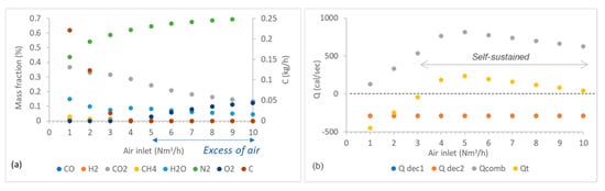 Figure 9a shows the mass composition of the produced gas (left side) and the remaining solid carbon mass flow (right side) at varying air inflow. As expected, the carbon content (red dots) decreased with the increasing air flow because of combustion reactions, whereas O2 remained equal to 0 until a value equal to 7.5 Nm3/h (stoichiometric air). Above it, carbon was completely burnt and O2 was in excess.