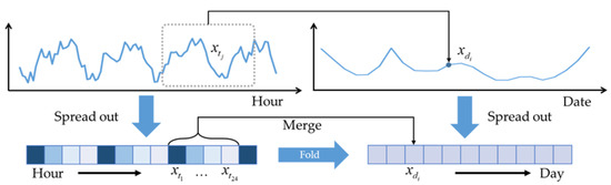 Further, we use Figure 2 to explain the above two-dimensional structure. In the left figure, an individual curve represents the data on different days and the cluster of curves demonstrates the daily electricity consumption. Then the expansion of the cluster is a grid, as shown in the right figure, which is also formulated as Equation (5). The height of the grid represents the number of data points from one day points. The length of the grid represents the number of days. In other words, the grid of electricity consumption data is a two-dimensional time-series.