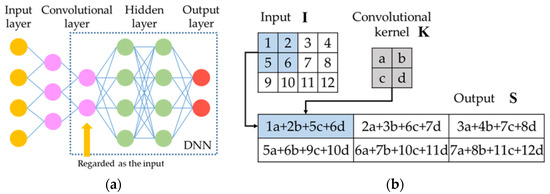 The normal multilayered neural networks, which are also called deep neural networks (DNN), consist of input layers, hidden layers and output layers. CNN has an additional convolutional layer, as shown in Figure 3a. The discrete convolution is the key operation in convolutional layers. As shown in Figure 3b, we use a 2 × 2 kernel as an example to illustrate the discrete convolution. The input has a value in each grid. Then, a two-dimensional kernel function is used to extract features. The output of the convolution is: