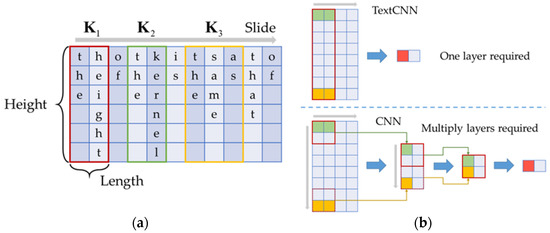 The kernel size is the main difference between CNN and TextCNN. As shown in Figure 4a, we use height and length to describe the size of a two-dimensional kernel. The commonly used kernel size in CNN is 3 × 3 [31,32], while in TextCNN the height of kernels is always equal to that of input data [27]. This is because for text classification, the most significant thing is to efficiently capture the internal features of an individual word and the correlations between multiple words. As shown in Figure 4a, the convolutional kernels are sliding windows with the same height as a single world. The kernel will only move in the length direction, so each time the kernel will slide over a complete word.