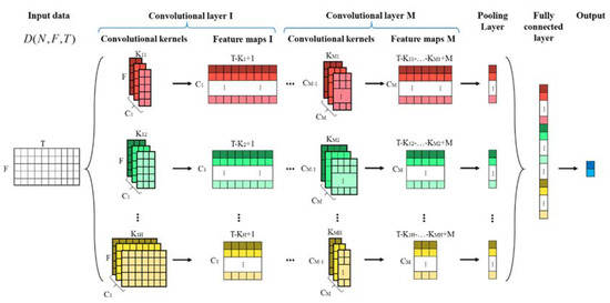 In order to extract the time features and compress the amount of data, the feature maps of the first convolutional layer should be convoluted multiple times. Thus, there are multiple convolutional layers in the proposed neural network. It is worth noting that the kernel size of the previous layer is not necessarily equal to that of the next layer. For instance, the kernel size of in the upper layer is , and in the next layer is . and are independent of each other. After passing through these convolutional layers, the feature maps of kernel size are expressed as: