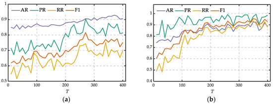To study the effect of the length of the intercepted window on the proposed model, we conducted an experiment on dataset (a) and dataset (b) by changing the value of from 10 to 500 with a step size of 10. Figure 8a,b shows the experiment results of dataset (a) and dataset (b), respectively.