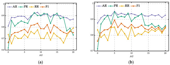 Performances of different . (a) Trends of indicators in dataset (a); (b) trends of indicators in dataset (b).