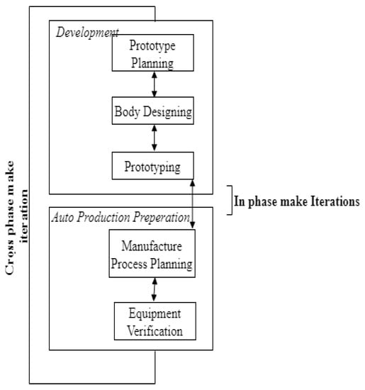 In our proposed framework, we have two main phases of manufacturing—the development phase and the production preparation phase on which the principles of agility are applied. In the first phase, we have three subactivities. At the planning stage, the functionality, feasibility, and resources of the whole auto system are planned. After that, the design is carried out, which includes body design models; at the end of designing, different prototypes are prepared to determine the final model of the automobile. All three activities are carried out incrementally, and these steps can be iterated in order to refine the final model. This iteration is called in-phase iteration, as shown in the figure below.