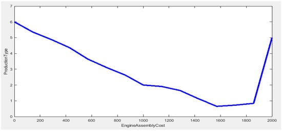 We used a fuzzy scale to find out the effect of cost and time fluctuations of Engine Assembly on the production. The cost is classified as less, moderate, high, and very high. Similarly, the time is classified as extremely less, very less, less, and very long. The production type is distributed as moderately agile, agile, less agile, traditional, and less traditional. The fuzzy rules are generated accordingly to measure the effect of cost and time on the production type. The cost, production type, and time scale are supposed to be based on continuous values. The engine assembly time is assumed with a range of 0–60 min while the assembly cost from 0–2000 dollars. The production type ranges from 1–5, showing higher agility and traditional approach on both the extremes.