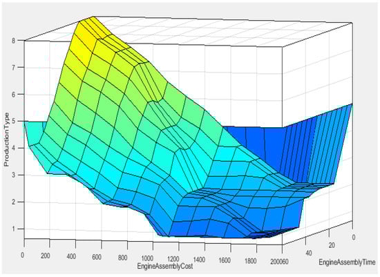 The attained 3D surface in Figure 7 below shows the impact between two input variables, cost and time, on the output production. In this surface graph, agile results are attained based on our defined rules. Less the assembly cost and time, the production type moves towards the higher values of agility (yellow).