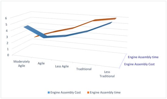In Figure 8 below, the 3D line graph shows the relation between the assembly time of automobile engine and the total cost involved in the assembly using the scale of moderately agile, agile, less agile, traditional, and less traditional manufacturing process.