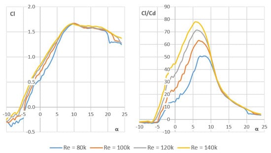 Validation of the computational method was performed under much more demanding aerodynamic conditions (low Reynolds flow regime, on average between 20,000 and 80,000) than the expected operational range of the full-scale prototype, where Re values exceed 100,000. In the latter case, an increased Reynolds number tends to provide airfoil stabilization compared to the case of diminished models. Thus, it was concluded that if the small-scale analysis proves high accuracy of the numerical predictions corresponding to the experiment, it can be presumed that the results computed for a full-scale prototype are also reliable.