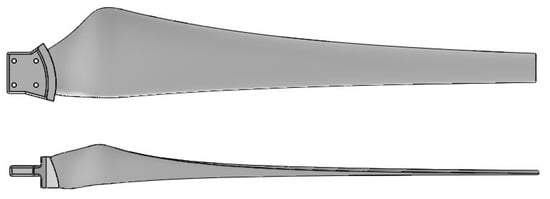 All the conducted calculations yielded the chord length and twist values determined for each separate blade cross-section. As the implemented methods were not suitable for the blade root region [], three sections placed closest to the hub were neglected in the described calculations. A different airfoil, NACA 0024, was used for the blade root to increase thickness of the outline and improve mechanical strength of the whole blade []. A 3D CAD model of the designed geometry is depicted in Figure 3.