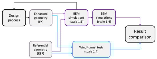 The procedure is graphically described in Figure 4. After the enhanced blade design prepared, both REF and FX geometries were initially analyzed with the same BEM-based software in 1:1 scale. Having obtained the results, the evaluation was made if the newly prepared blade geometry was likely to improve turbine performance or if the second iteration of the design process should be conducted with modifications in blade geometry (twist angles, chord lengths, etc.). If the design was auspicious (depending on assumed criterion; in the presented study potential gain in Cp value), the procedure was followed in wind tunnel tests in scale 1:4. Due to such an approach, it was possible to avoid an excessive usage of the wind tunnel facility, thus minimizing the process costs. Simultaneously to the wind tunnel tests, the numerical representations of the compared geometries were scaled to the experimental model size and recalculated to obtain validation data.