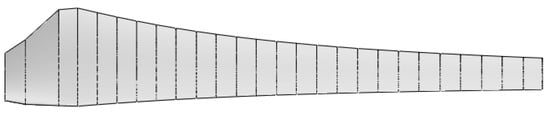 The classical Blade Element Momentum Theory allies results of the actuator disc assumptions [], which describe physical parameters around the rotor in general, with a discretized system of equations. Main calculations are executed for a rotor model with an infinite number of blades. Real parameters, such as an actual blade number and their geometrical characteristics, are employed as mathematical corrections in the formulas []. All numerical calculations were performed with the QBlade software [], which combines multiple wind turbine assessment tools, including BEM and XFOIL. The blade geometry, divided into particular cross-sections and prepared for BEM simulations, can be seen in Figure 5.