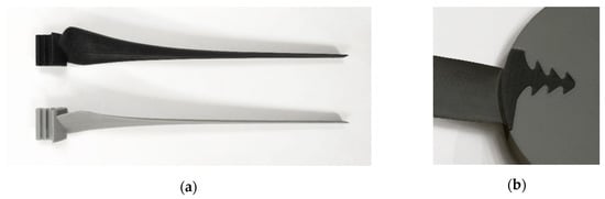 Each set of the tested blades was prepared as 3D-printed elements in ABS material, manufactured in the FDM technology (see Figure 6a). The selected method of production significantly shortened the time required to prepare the experiment. Moreover, the technology was in accordance with full-scale blades. The prototype rotor parts were 3D-printed as well, with the SLA method. An original connection between the blade and the hub was redesigned (Figure 6b) due to diminished dimensions of the whole rotor.