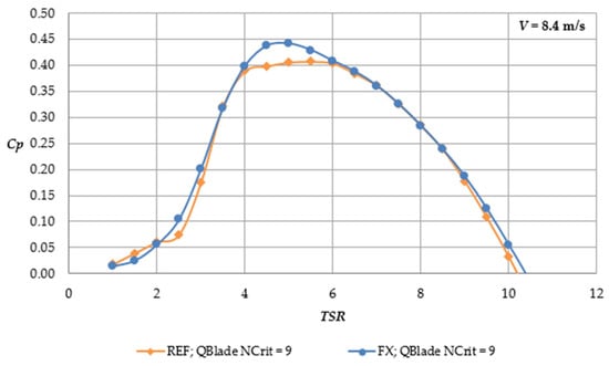According to the simulations, the recently designed FX blade geometry provided the rotor with a higher maximal power coefficient (see Figure 9). The power coefficient value increased by 7.3% compared to the maximum for the reference geometry, granting Cp equal to 0.44 for the rated point (TSR = 5). The maximal value of Cp for the reference blades appeared for the tip speed ratio equal to 6, which is a higher value than the claimed design maximum at TSR = 5. The curve shape, however, seems to be visibly flattened around the operational point of the turbine. Thus, the newly designed geometry seems to be a solution which is more specialized for particular conditions and can significantly increase the turbine performance if the operation requirements are maintained.