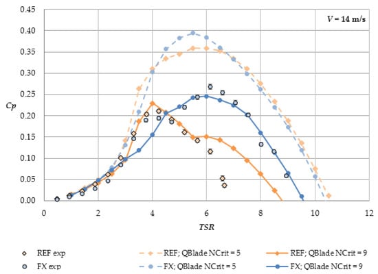The overall behavior of both rotors changed significantly compared to the data computed in full-scale simulations. Both curves do not reach as high maximal Cp values as before, settling between 0.39 and 0.41 for the FX geometry and between 0.36 and 0.38 for the reference blades, depending on the wind speed. However, the percentile gain in the power coefficient value was equal to 7.9%, which is a very similar difference to the full-scale simulation outcome (7.3% in the Cp increase). One can, therefore, state that a relative Cp gain remained similar regardless of the numerical model scale.