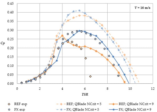 The TSR overestimating effect did not happen for the FX geometry. The computational results for NCrit = 9 provided the curves which were comparable to both the diagram expected from the BEM theory and the obtained experimental points. No sudden decrease in Cp was observed in the simulation results. What is more, the experimental data seem to reach their maximal range very closely to the numerical predictions. Measurements and simulations of the FX geometry at the wind speed of 16 m/s resulted with nearly identical Cpmax values (0.295 for the tests and 0.300 for the simulations). Outlines of the 16 m/s characteristic curve were nearly identical, with only a slight shift of the experimental curve towards lower TSRs.