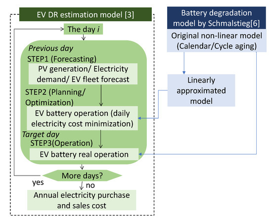 We adopted the degradation model derived by Schmalstieg [6] for an NMC battery, which is commonly used as an EV battery. In this model, calendar and cycle aging were separately modeled, and the parameters of the model were quantitatively described. The framework of this study is shown in Figure 1. A linearized battery degradation model was incorporated into the optimization model in the planning step in the EV DR estimation model, and the original detailed nonlinear model was used in the final cost calculation in the operation step.