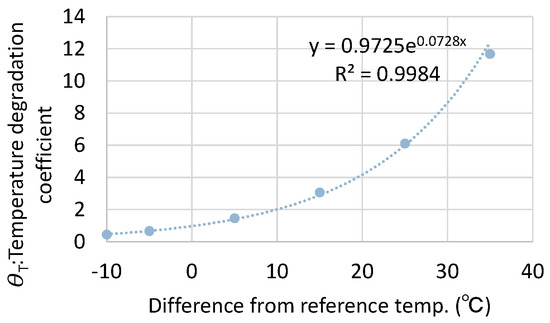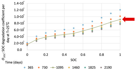 Figure 2 shows the contribution of the SOC to the degradation, which is called SOC degradation and is obtained from Equations (2) and (3) at the reference temperature. Here, V in Equation (3) was calculated through the linear interpolation of the plot in Figure 3. SOC degradation, when the elapsed time was 1090 days (3 years), which was assumed to be half of the battery life, was adopted as the average SOC degradation model, which was approximated by a linear piecewise interpolation. We assumed that the battery life was 6 years based on the information of the actual value of the warranty period of 5 to 8 years for in-vehicle batteries. To obtain the temperature degradation coefficient, Equation (3) was modified, and 𝛳𝑇 was plotted as a function of 𝑇 minus 𝑇𝑟𝑒𝑓 and fitted as an exponential curve, as shown in Figure 4.