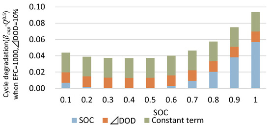 where 𝛳dod is the linearized DOD degradation coefficient per EFC for cycling aging. Figure 5 quantifies the contributions of each parameter by showing the cycle degradation obtained with Equations (6) and (7), when EFC = 1000 and DOD = 10%. When the SOC contribution is greater than or equal to 20%, the cycle degradation increases with SOC. As storage batteries usually operate under this condition, the reduction of SOC basically leads to the reduction of cycle aging. Furthermore, a lower SOC is preferred in the optimization model for the influence of SOC regarding calendar aging, and the impact of the neglect of SOC degradation regarding cycle aging is considered to be small in terms of optimization.
