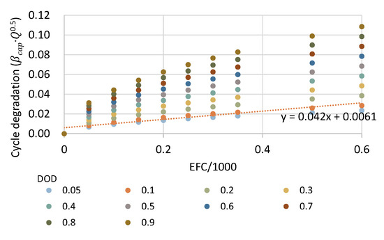 where Q is the energy throughput (EFC), which is the number of cycles required for the accumulation of the number of Ampere-hours stored in the battery. Q equals 1 at a one-cycle operation of 100% DOD.