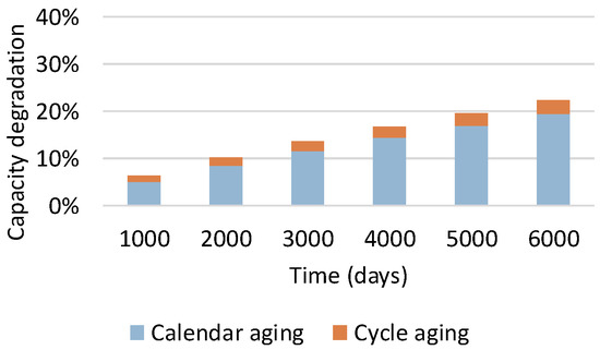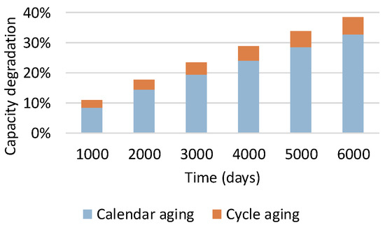 Generally, battery degradation is evaluated based on the highest value when comparing the capacity fade and power fade. Most of the previous studies have already addressed capacity fade degradation. Therefore, we also calculated the degradation cost due to capacity degradation based on the degradation model derived by Schmalstieg [6]. The NMC model [6] is a holistic aging model that uses an impedance electric–thermal mode based on an accelerated aging test set, which consists of more than 60 cells of a commercial high-energy 18650 system with NMC cathode material. Both calendar and cycle aging were separately evaluated in the model.
