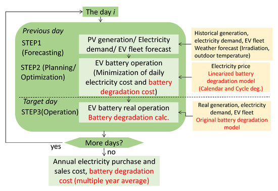 In this work, the information in red letters in Figure 9 was added to the process to consider battery degradation. In the planning stage, the degradation cost was added to the objective variable, and the linearized degradation model was added to the constraint conditions. The operation of the battery was optimized to achieve the minimum cost. In the operation stage, the operation of the EV battery was conducted based on the plan in the previous step, actual PV power generation, and actual EV availability, and the degradation cost was calculated from the original model shown in Equations (2), (3), (6) and (7). The following are the optimization methods for the planning stage and the rules for the operational stage.