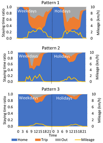 Annual average staying time ratio and mileage in the driving pattern data of three EVs.