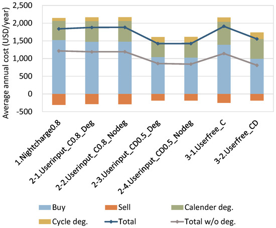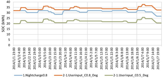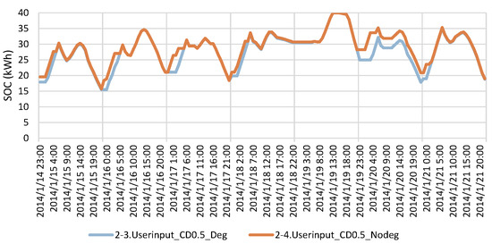 The user-free cases (3-1 and 3-2), in which planning and optimization steps were not conducted, became less economical than the respective user input cases (2-1 and 2-3) when the battery degradation cost was considered. They were more economical than the user input cases when the battery degradation cost was not considered [3], and the effect of considering battery degradation led to the opposite result. This conclusion was achieved as cases 3-1 and 3-2 required relatively high SOC to fulfill the safety assumption made in the previous section.