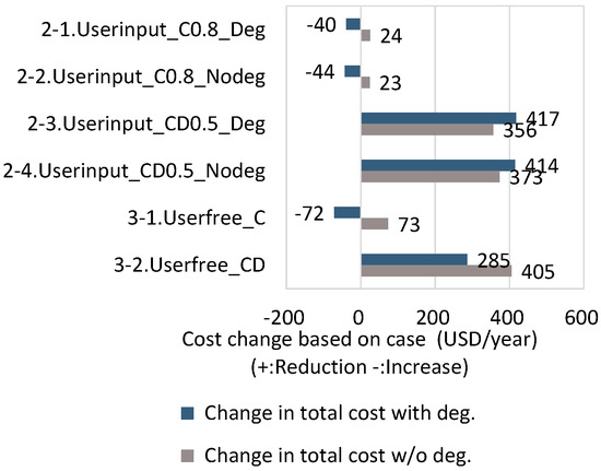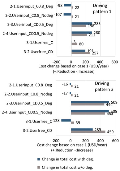 The results obtained when different driving patterns were used are shown in Figure 17. The cost in the charge control case was increased by US$98 when compared to the base case. Furthermore, the cost due to the charge and discharge control was reduced by US$285 for driving pattern 1, in which the driving mileage was high and the staying periods were short. Regarding driving pattern 3, in which the driving mileage was low and the staying periods were long, the cost in the charge control case was increased by $16 compared to the base case, but the cost in the charge and discharge control case was reduced by US$509. As the availability of batteries at the residence of the user was relatively high, longer staying periods led to a greater cost advantage for the charge and discharge control cases.