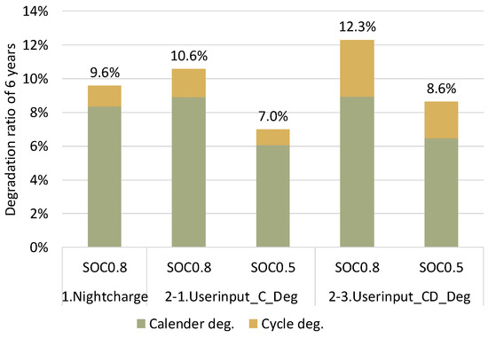 Figure 16 shows the total degradation rate for driving pattern 2 by accumulating the degradation costs over six years, assuming the same one-year operating results for each year. By comparing cases 1 and 2-1, the degradation ratio of case 2.1 was 1 percentage point higher than that of case 1 (nighttime charge) because of the higher average SOC. Furthermore, the cycle degradation was higher when compared to that of the base case, as the cycle degradation was dependent on the SOC function, as shown in Equations (6) and (7). If the reference SOC was 0.5, the degradation ratio could be reduced to 7%. Regarding case 2.3, the degradation ratio was significantly larger than that of the base case when the reference SOC was 0.8. By contrast, this value was reduced to 8.6% when the reference SOC was 0.5. The frequent charge and discharge cycles could not be modeled for actual EV driving, as the period in which each model simulation was conducted (hourly) was not small enough. Therefore, the actual cycle degradation is expected to be higher than that shown in Figure 16, as described in Section 3.2.