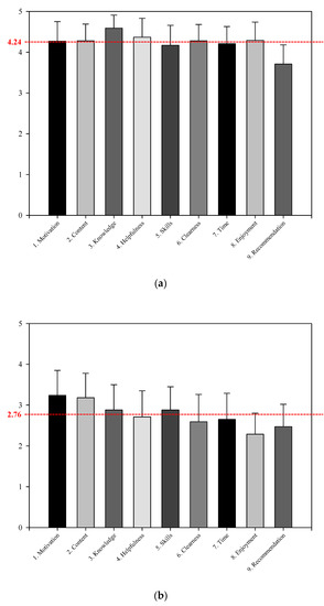 Obtained mean value from answers of students to questionnaire after performing (a) modeling-simulation and (b) traditional classes (red line represents the mean value of the questionnaire).