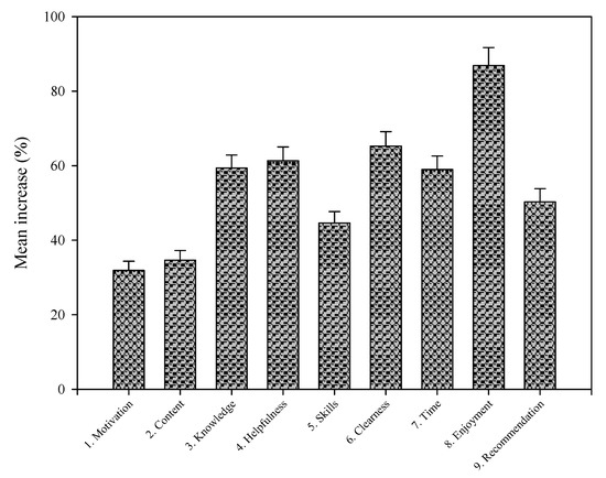 Finally, Figure 5 shows the mean increase (%) between results for modeling-simulation with respect to traditional classes. It is noted that students’ perspective improved with the modeling-simulation classes, highlighting the enjoyment, because students thought that the modeling-simulation classes were more enjoyable than the traditional one (with an increase of 39.9%).