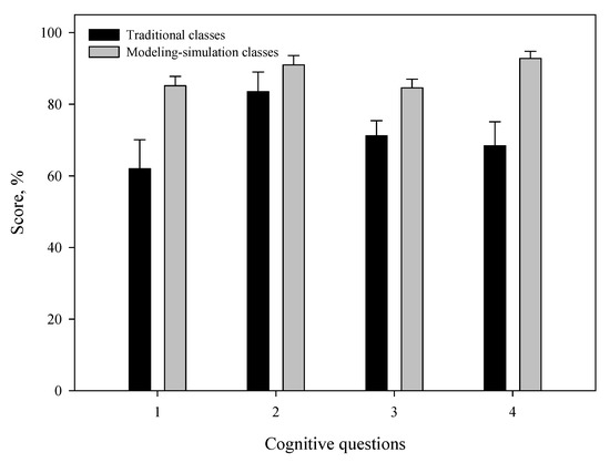 Figure 6 presents an assessment of how the activity significantly improved learning outcomes compared to the traditional teaching. In all questions, students that participated in modeling-simulation classes got a better score than students that received traditional classes based on the description of matter by the teacher and resolution of the same examples/exercises by the students but without the use of Berkeley Madonna software. Results showed that the differences between both teaching systems were especially substantial in questions one and four. These results were also observed by other authors [8,11,18,30] in similar work experiences. Therefore, it can be concluded that the STEM students improved their skills when they were involved in an innovative learning based on modeling-simulation practices [12,31], achieving the proposed goals in the work. Findings indicate that changes embedding work-based learning into academic programs should be considered.