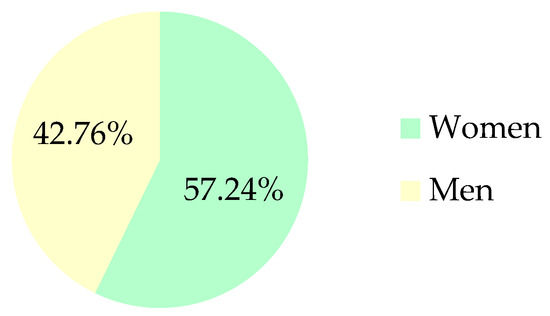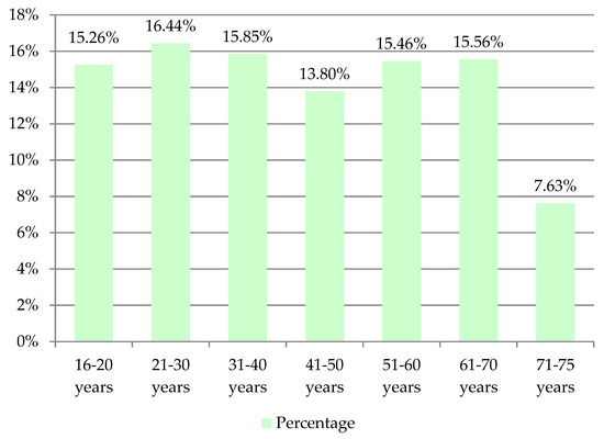 The survey asked respondents to identify their age group (aged 16–20, 21–30, 31–40, 41–50, 51–60, 61–70, and 71–75). The survey involved 585 women, representing 57.24% of the total number of respondents, of which the percentage was women: 54.49% aged 16–20, 49.4% aged 21–30, 54.94% aged 31–40 years, 62.41% aged 41–50 years, 59.49% aged 51–60 years, 62.26% aged 61–70 years, and 60.26% aged 71–75. For the opposite sex, 437 men participated in the survey, representing 42.76% of all respondents, of which 45.51% were men aged 16–20, 50.6% aged 21–30 years, 45.06% 31–30 years, 37.59% aged 41–50 years, 40.51% aged 51–60 years, 37.74% aged 61–70%, and 39.74% aged 71–75 years.
