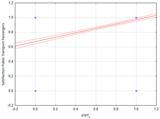 The analysis showed one significant relationship between the advantages of using electric buses in the city: “Keep Calm” and the satisfaction of the passengers using public transport. Unfortunately, no significant relationship was found between STPT2, STPT3, STPT4 and the increased satisfaction of public transport passengers. Therefore, to define the nature of significant interactions of the influence of the advantages of using electric buses on the increase in SPTP—in the context of a Polish city—the study tested the hypotheses using regression analyses that estimate this impact (Equation (2)).