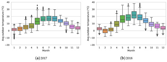 In this study, we only assess the substations’ behaviour while space heating is needed. Figure 1 shows the yearly seasonality of the outdoor temperature recorded for one building in two consecutive years. As one can see in Figure 1, the average outdoor temperature in 2017 during January–April and November–December is below 10 °C. The heating season in 2018 mainly includes January–April and October–December.
