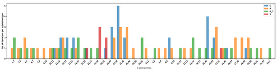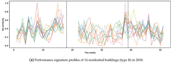 As mentioned above in Section 4.3, the assessed similarities of a substation’s operational behaviour can be used to build the substation performance signature profile for the entire studied period. Additionally, such profiles can be used to compare substations belonging to the same heat load category. We studied four types of buildings: C, R, R-C, and S (see Table 2 for more information). Figure 2a shows the signature profiles of 14 residential buildings in 2018. The area between the two vertical dashed lines represents the non-heating season in all figures. Figure 2b depicts the performance signature profiles of the substations of nine company buildings for the same year. Figure 2c contains the largest number of buildings belonging to the R-C category; i.e., 20 in total. Figure 2d represents the signature profiles of four schools. All the studied buildings are located in the same city. As one can see, Figure 2a–d contains signatures that are quite similar in the period of week 1 until week 18 (1 January–6 May 2018) and week 45 to week 46 (5–18 November 2018).