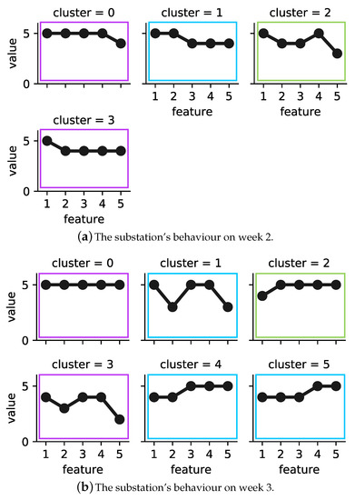 Figure 3 shows the operational behaviour of building B_3’s substation during weeks 2 and 3 in 2017, where low is represented by one and high by five, respectively. Note that each category is the result of differencing to adjust yearly seasonality for each feature. Figure 3a represents four operational behaviour modes of building B_3’s substation during the second week of 2017. Cluster 2 covers 57 h, the largest number of hours among the sample, while cluster 1 covers only 26 h, which is the lowest number of hours. In week 3 (see Figure 3b), six operational behaviour modes were detected. Cluster 3 in this week, similar to cluster 2 in week 2, covers 57 h. Cluster 4, with the lowest number of hours, covers only 11 h.